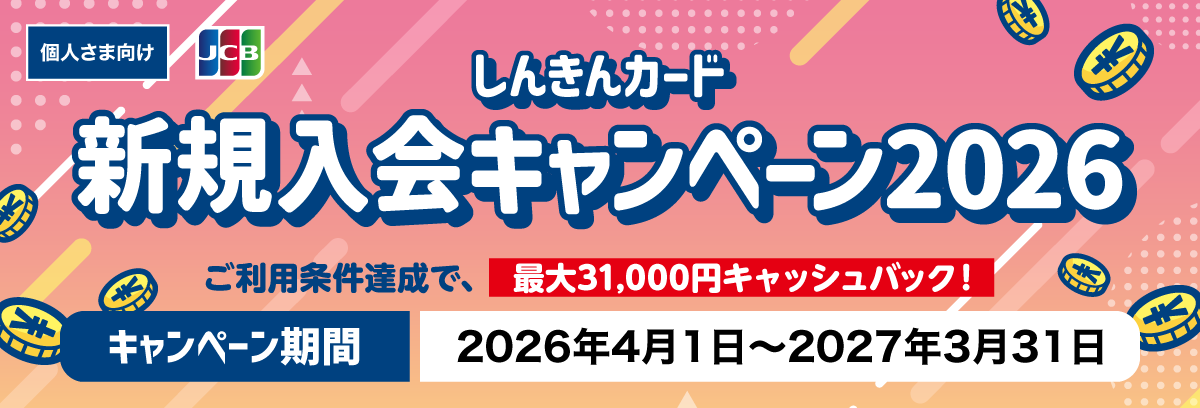 - 本キャンペーンは、しんきんカー ドJCB(個人)に新規でご入会(一般カード・JCBカードSからゴールドカードへの切替も対象となります)いただいた方が対象となります。